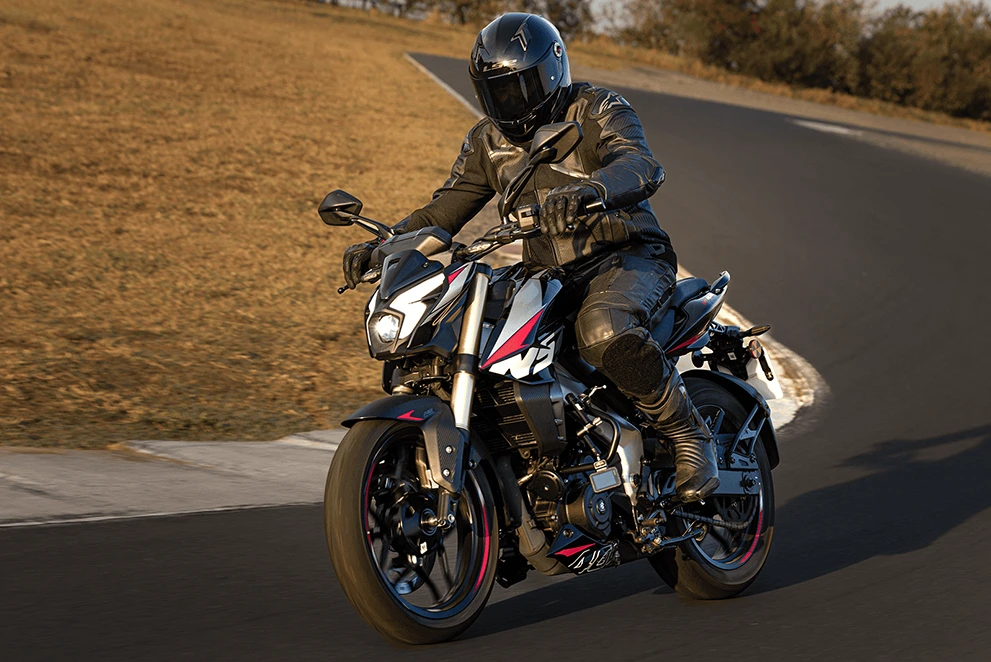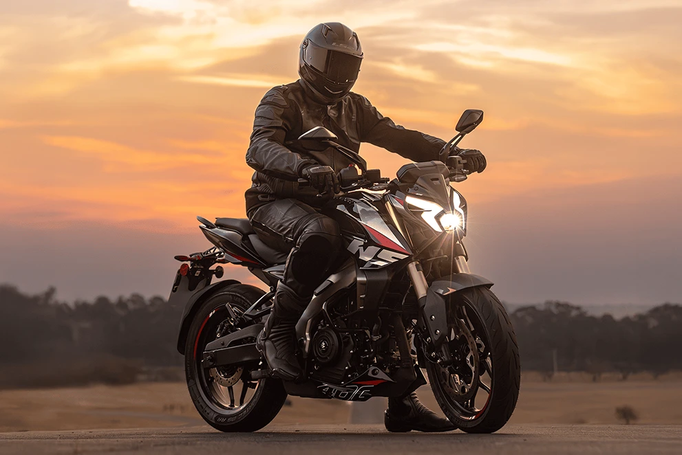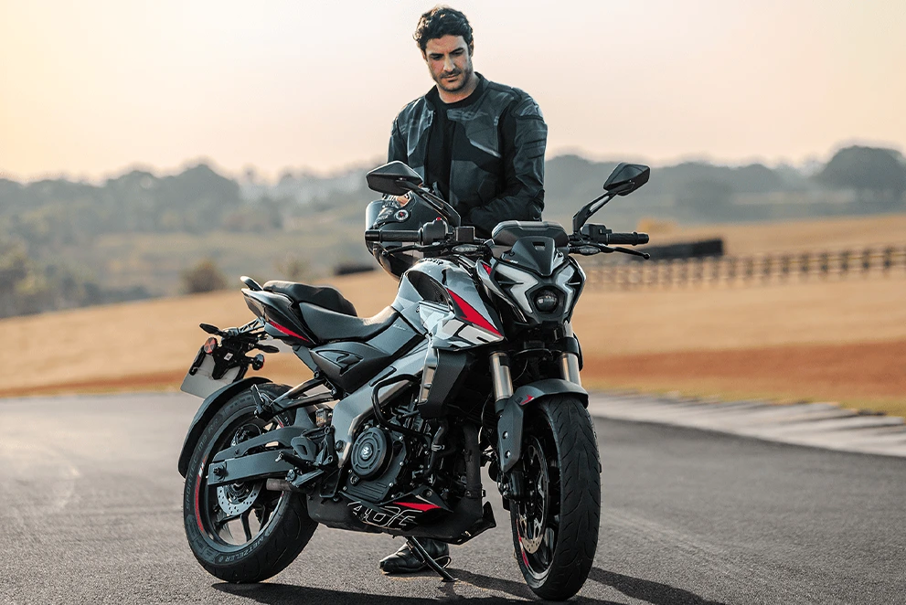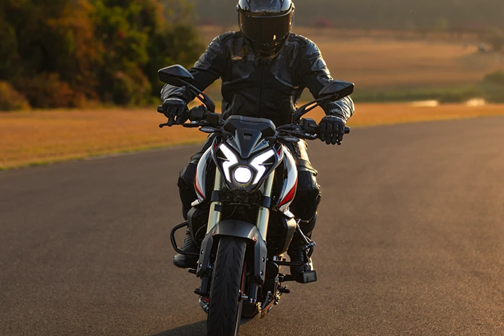 Os DRLs (Luzes de Condução Diurna) são a assinatura visual da Dominar NS400Z. Com design exclusivo em formato de raio, os faróis elevam o padrão estético da moto e garantem alta visibilidade em qualquer situação, reforçando a presença da naked 400cc da Bajaj nas ruas.
